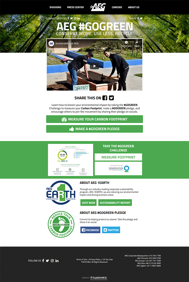 We recently launched the AEG Go Green microsite as part of Earth Day 2019 to encourage users to conserve more, use less and recycle, plus make them aware of AEG's global conservation efforts. The microsite allowed users to measure their carbon footprint using an interactive calculator, share the #GoGreen pledge and watch video and other material from AEG's 1EARTH initiative. The microsite is available at: http://www.aeggogreen.com/