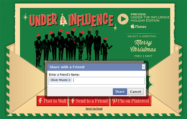 Users can publish their card directly to their Facebook album. This causes it to also appear on their Facebook wall and links back to an interactive version of the e-card.