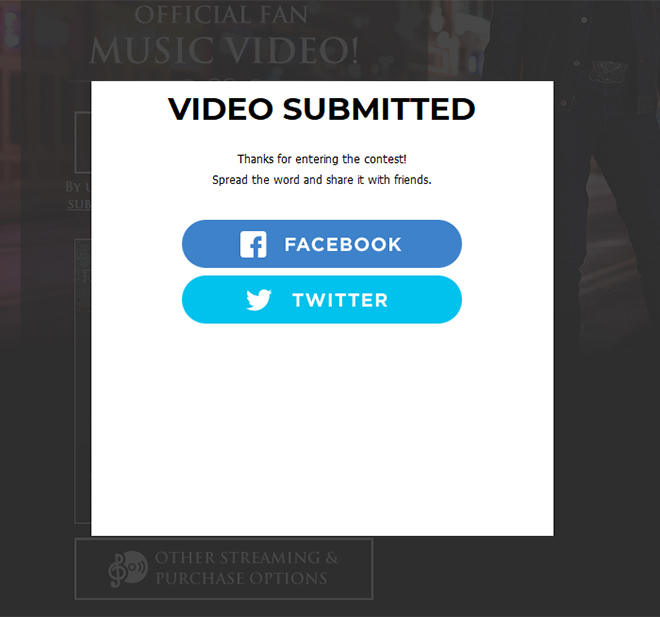 This is a recent video submission campaign we launched for country music artist Ronnie Dunn. The idea was to encourage fans to upload the "Together Again" videos for a chance to be featured in Ronnie's official music video for the song. Fans could upload videos in most popular forms on their mobile phones or via the desktop and were asked to provide important release information and permission, in order for them to complete their submissions. The campaign featured the ability to manage the videos on the backend. You can check it out here: xxxx