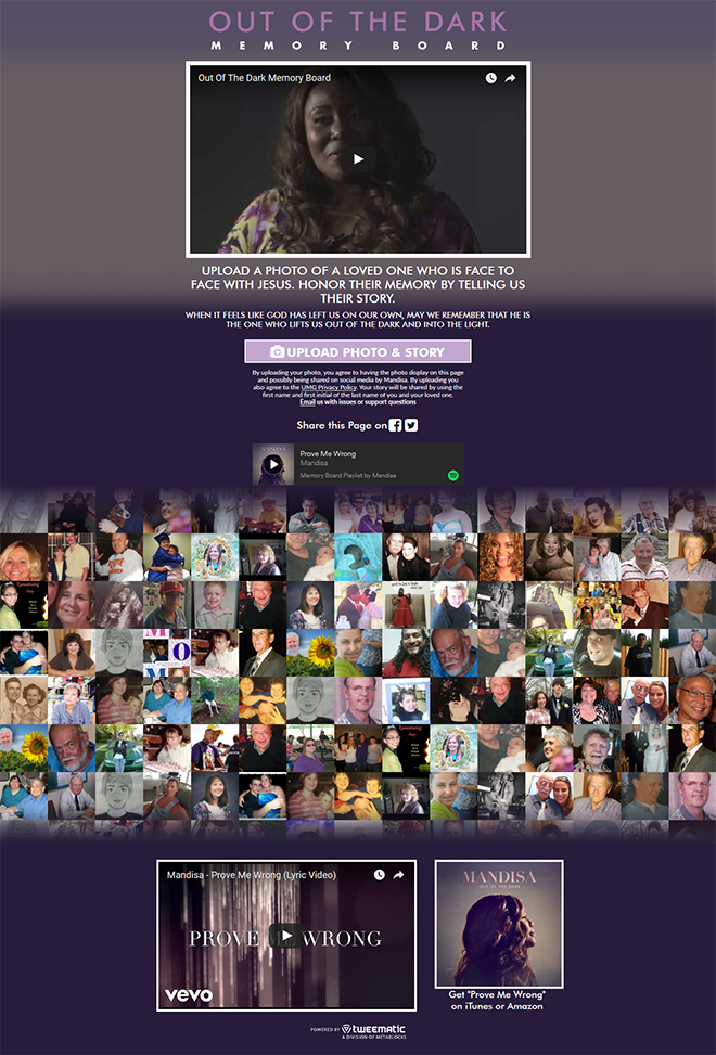This is a unique content wall campaign for Capitol Christian Music Group artist Mandisa that allowed fans to upload a picture of a loved who had passed away and honor their memory by sharing their story. The activation is located at http://www.tweematic.com/outofthedark/ Information...[…]